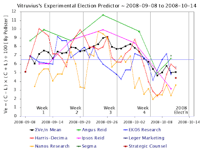 Polls are current as of Friday or Saturday. Pick graph image for larger view. I have moved the dark blue Conservative majority breakpoint line in the graph from +8 to +6.5, since that is more accurate. For the last three days, ΣVe/n has predicted 137, 135, and 136 Conservative seats. The current spread is from 122 to 160 seats.
