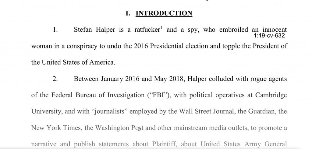 This is from the footnotes in the suit. I guess a Ratfucker is always a Ratfucker in English or Russian. Too bad Stefan Halper will never be introduced on any news program as “The Ratfucker Stefan Halper.”