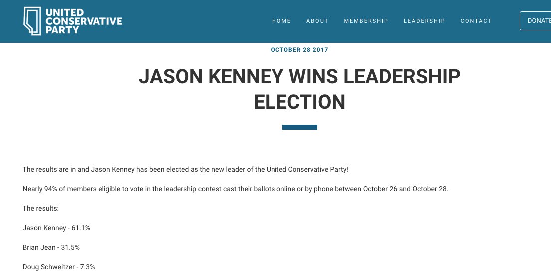 This is a disaster. The worst case scenario I envisioned from unification has happened. Before, with Jean at the helm, it was clear that Notley didn’t stand a chance of re-election. Now I wouldn’t bet a dollar against that happening. Kenney is an idiot, the chunky loud and ineffectual bloviator that conservatives seem to love lately (Trump, Ford). He’s going to be a disaster. Instead of focusing on real issues like healthcare choice he will blow hot air at Ottawa and pay too much attention to pipelines. Alberta’s problems mainly originate from Edmonton, not Ottawa.