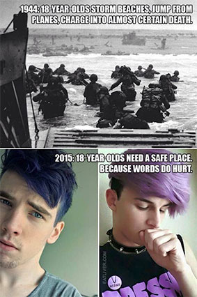 “I realize the nature of war is different today, but my question is, if a war of this nature were to ever break out again, would those in that age demographic step up as they did generations ago? I am not talking the career types, but the ones leaving home, jobs, and parents to do what needed doing. Take a look at today’s universities and society in general – safe spaces, the right to not be offended, gender fluidity, etc.”