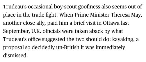 “Trudeau’s occasional boy-scout goofiness also seems out of place in the trade fight. When Prime Minister Theresa May, another close ally, paid him a brief visit in Ottawa last September, U.K. officials were taken aback by what Trudeau’s office suggested the two should do: kayaking, a proposal so decidedly un-British it was immediately dismissed.”