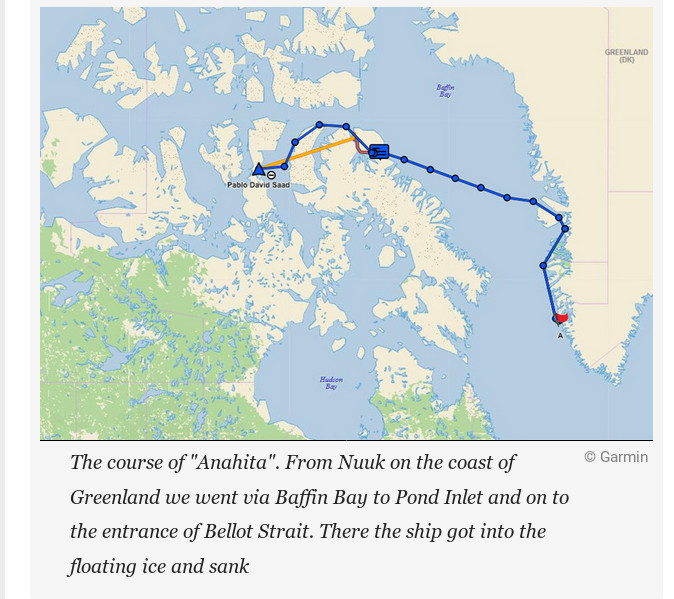 ……….”The Anahita, like about a dozen other yachts, was on its way east-west through the Northwest Passage. This summer, however, the ice in the Arctic is persistent. Unlike in previous years, so far there has not been a clear path.”