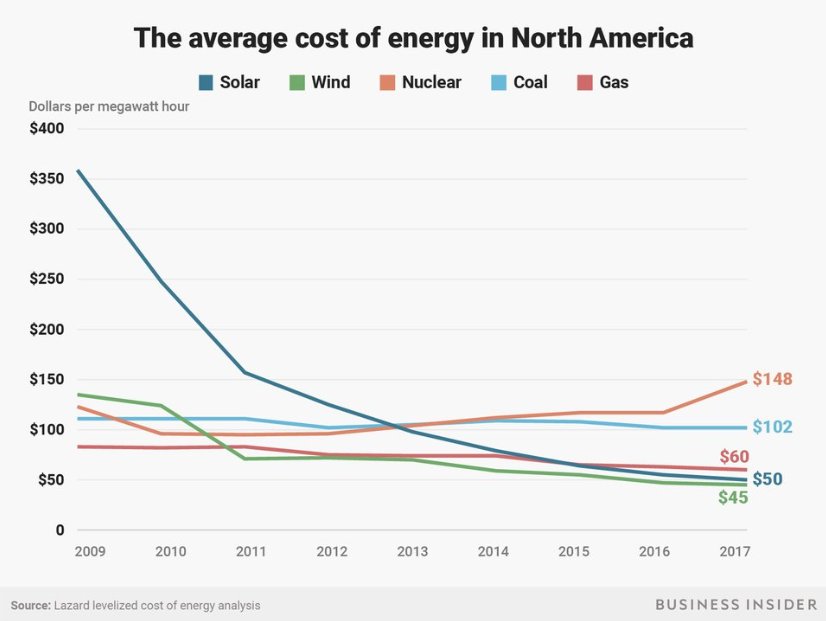 “The average cost of energy in North America” displayed the costs going into the grid, so for wind and solar, take the average cost of the reliable sources, add 25% for stepped inefficiencies (they must provide “spinning back up” for the completely random timing for wind and less unreliable for solar as these unreliables get priority otherwise their meager capacity factors would be worse) times 75% for the duration of time that they run when the unreliables don’t and average that with the cost of unreliabels and you get a roughly average (and grossly simplified) cost just above that of Coal. Take wind and solar off the grid, and those numbers are more accurate but quite useless for the energy market.