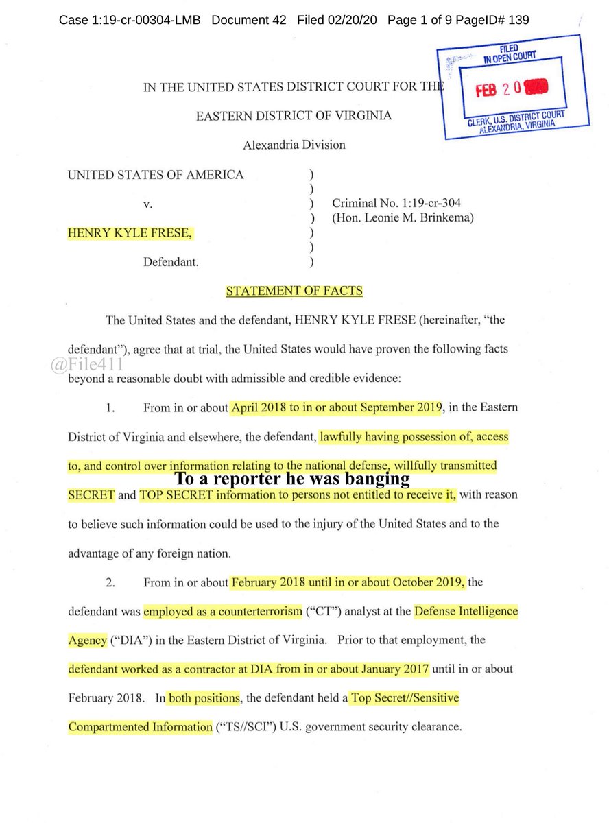 Yesterday, Henry Kyle Frese, a DIA employee, plead guilty to charges related to his disclosure of classified national defense information to two journalists in 2018 and 2019. https://t.co/wNWqOfSMZ4 pic.twitter.com/bK7jbPknAy