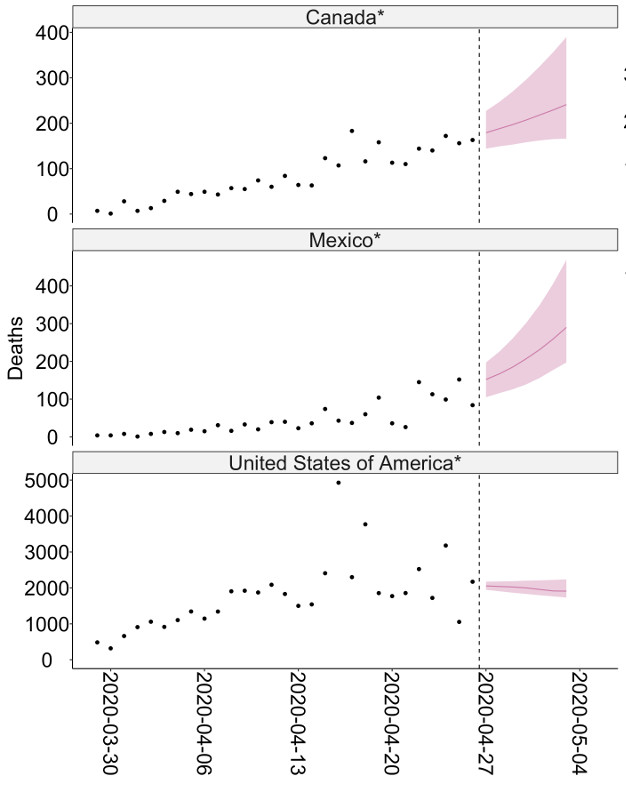 Re the Imperial projection of expected deaths in Canada for week starting 27 Apr 2020: I checked PHAC website for daily reported deaths. They totalled 1,122 for 27 Apr to 3 May. Peak day was 207 deaths, but every other day that week was below 200 [compare that to the upward swing of the pink chart — showing mostly over 200 and well over 200]. So: Imperial was correct in putting Canada into the “more than 1000 deaths” category for that week, but projection trend was wrong — we had much flatter trend of deaths that week (range of 116 to 188 deaths in the 6 other days that past week).