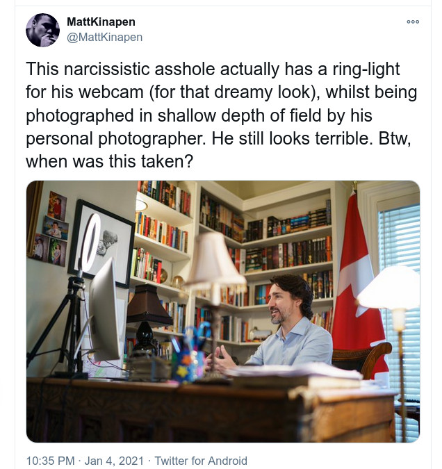 Nope,while all the Conservatives and Dippers flit about the world during this pandemic to end all pandemics and now slated to last until October 2022, our beloved Prime Minister is at home working diligently for all Canadians, even the tiny percentage that identify as conservatives.