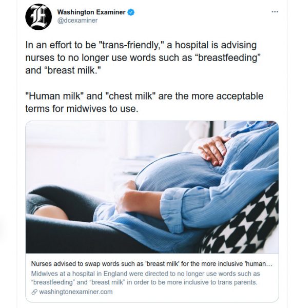 I wonder how long until strictly female anatomical body parts are “rebranded” to sanitize language of more feminine medical references. The funniest thing is how a hospital chooses to take a knee to what not so long ago was classified as mental illness. The hyper-sensitivity of biological male trans individuals is off the scale and its prescribed treatment is brown shirt Fascism. They’d get much further with funny bone and thick skin transplants. Appeasement of ideological bullies never seems to work as there’s no micro-aggression too small.