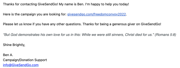 Learning all of the above, I immediately wrote GiveSendGo and received definitive, accurate information of where you can now safely donate funds to help the Freedom Protesters restore our freedoms: GiveSendGo.com/FreedomConvoy2022 (Please be patient because their servers are overwhelmed so you may very well get a 502 Gateway Error. Try again an hour later.)