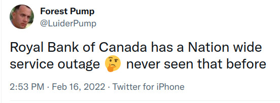 I never thought much of it till seeing the SDA post. Was at my RBC branch in MB about 14:30. All computers down and they had no idea why our when it would be back up. Just tried to access RBC online at 16:00. Response: “Sorry we’re having some technical issues, please try again later.