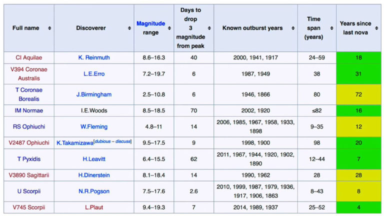Davidson’s video shows evidence that such micronova events are a cyclic part of the life of a star, and includes the following list of 10 known recurring nova events observed in the Milky Way.