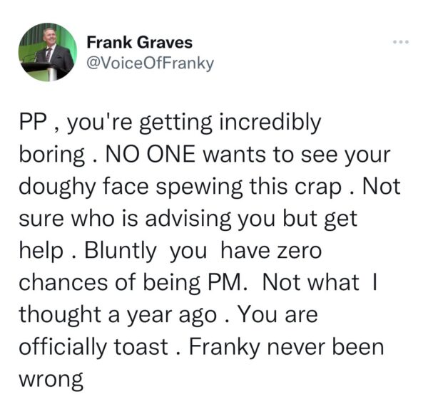 “Pierre Poilievre is an acolyte of authoritarian populism. This is never healthy. You are on notice. Going to make sure you are never going to lead my country. I don’t make idle threats,” Graves wrote on Twitter last week.” Quote from NP article dated April 22/22.