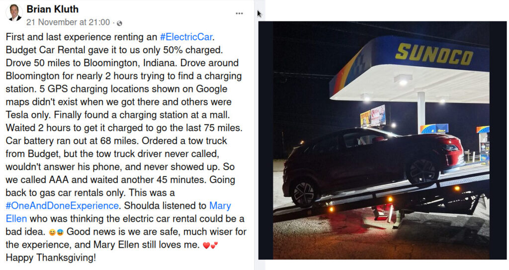 A coworker and I were in Germany a couple months ago and he rented an electric car for the 5 days we were there. Nice car and no issues until the morning we were flying out and needing to charge it back up before returning it. We left in plenty of time to charge before heading to the airport, unfortunately our ability to get it charged failed. First two charging locations we found were single stations and occupied. Next station we found an open charger but it turned out to be out of order after several failed attempts to get it to work. Fourth attempt found us unable to get over to the station due to lane restrictions and the fifth and final attempt had us driving in circles trying to access the lot before giving up in frustration and heading to the airport. Insult to injury was us passing several highly accessible and available gas stations on our journey to find an open, useable charger. He did agree in the end the electric car option was not wise and next time It will be a gas or diesel rental. Thankfully our company picked up the punishing fee for taking it back not charged.