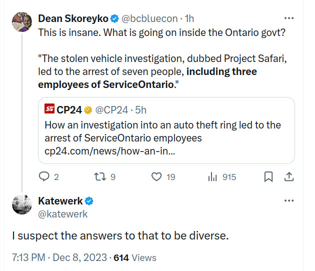 You have a unique situation with car theft. On a per capita basis, stolen vehicles in Canada are about 30% higher than in the US. I suspect your “diversity” reference is a big part of the reason. In Toronto alone, over 10,000 cars were stolen in 2023 (and that was as of Nov. 18th).