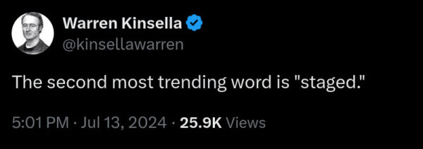 Kinsella should know all there is to know about staged, considering the ‘staged’ concentration camp number that was ‘staged’ years ago by our hostess. Why this poofter thinks he has any credibility in Canadian news cycles is an indication of how moronic the Canadian public is.