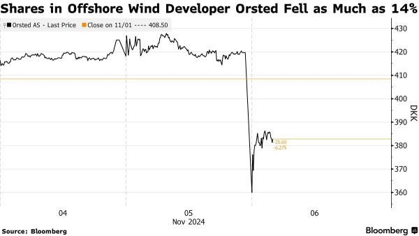 Shares in two leading Danish firms led the rout, with developer Orsted A/S dropping as much as 14% and turbine maker Vestas Wind Systems A/S sliding 13% in Copenhagen before paring losses. Other firms, including Germany’s RWE AG and Nordex SE, also declined.