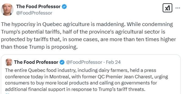25% vs 250% … it may be worth knowing as well that Quebec is guaranteed 50% of the industrial dairy sector within Canada. Even if you could produce milk for cheese in the west for $1. per gallon, you couldn’t sell it as Quebec has the market, and you’d end up dumping it as unsaleable.