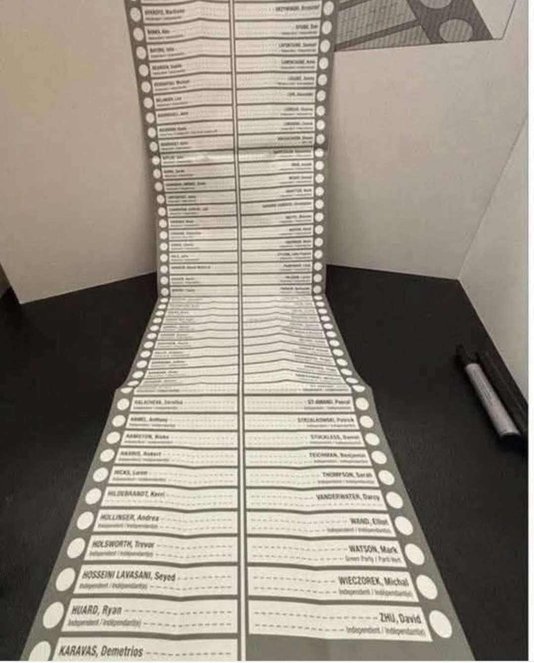 The TO bye-leccion next door to BabsFreeland got my attention for the longest ballot. A Con won over Lib stronghold parachutist , whodda thunkit.