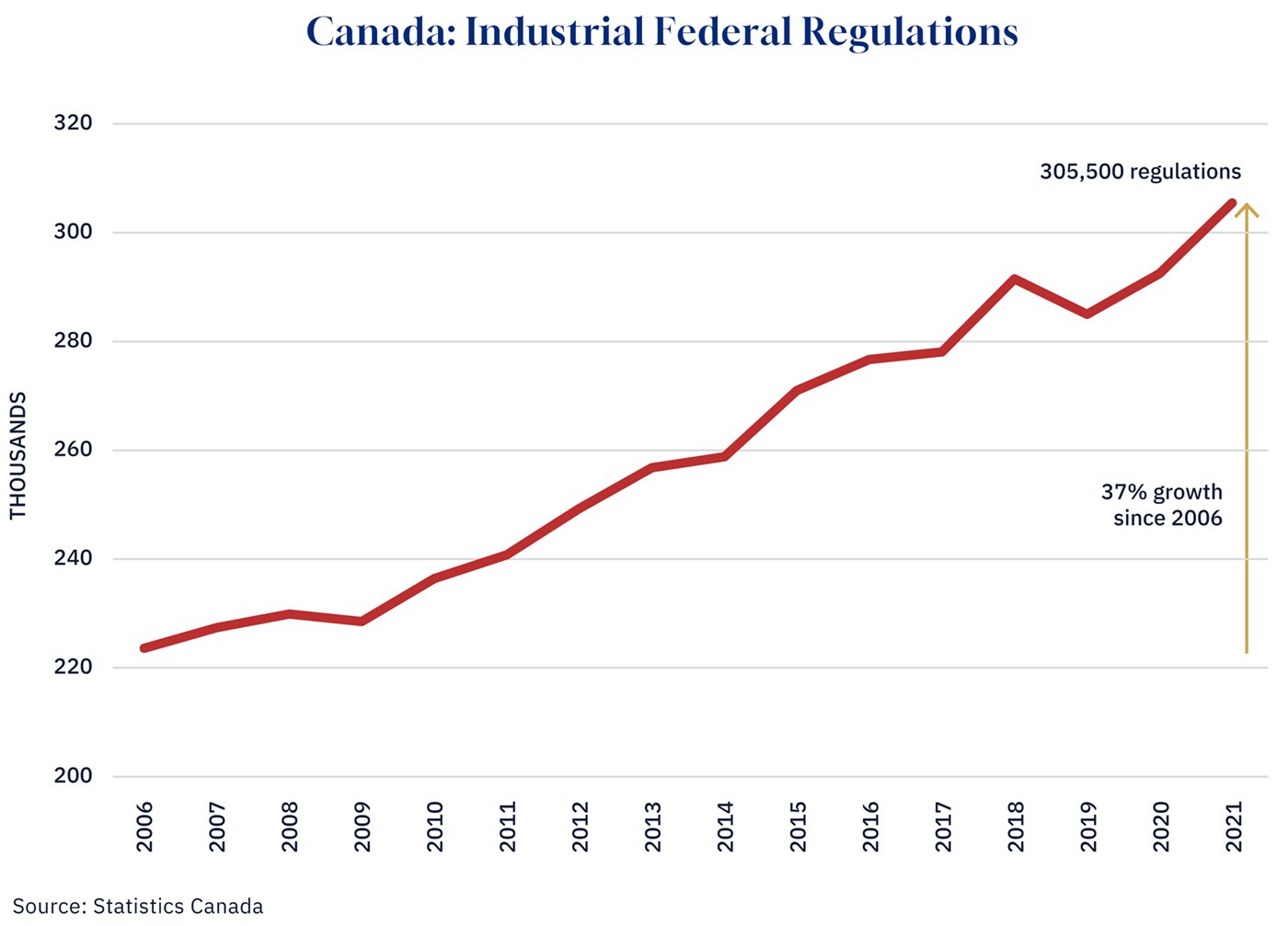 According to Statistics Canada, federal regulatory restrictions increased by 37% between 2006 and 2021. This surge has been linked to a 1.7-percentage-point decline in GDP growth, along with decreases in business investment, productivity, employment, and the rate of new business formation.