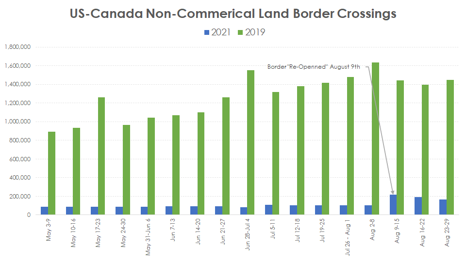 Canada opened the land border to fully vaccinated Americans on August 9th, hoping to spur recovery in their destroyed tourism industry.