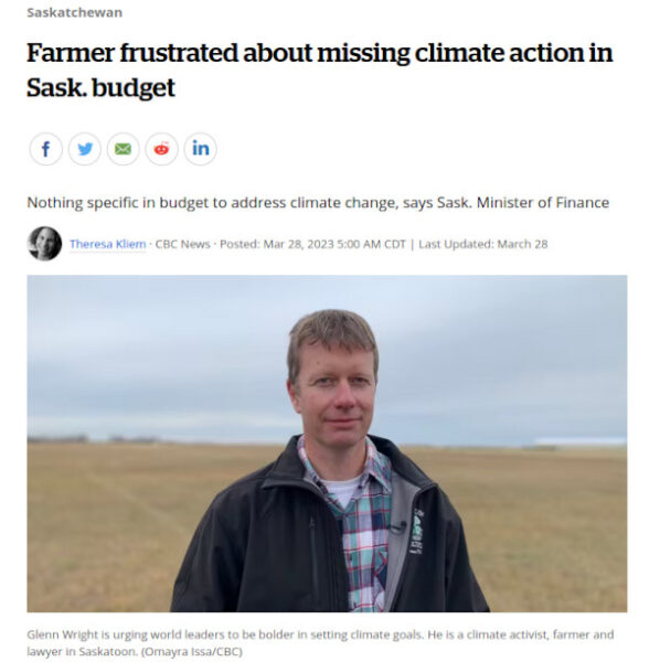 Oh noes! CBC’s Theresa Kliem has found a farmer whose unhappy with the SaskParty budget! Glenn Wright is “a climate activist, farmer and lawyer in Saskatoon.” Somehow, the photographer captured him standing before a field without snow.