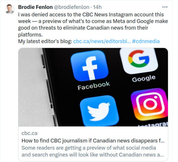Buried in a self-serving bromide salad regarding press freedom one finds a reluctant admission: the CBC just can’t quit Twitter.