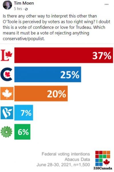 But given how much O’Toole has turned off the Conservative base (particularly in Alberta) by going back on his word on carbon taxes and adopting Liberal-lite policies on nearly every other issue, between the stay-at-home factor among Tory voters and the bleeding of support to all other parties, plenty of Conservative insiders are already predicting an epic defeat for their party.