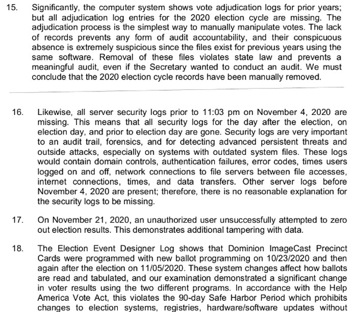 “The allowable election error rate established by the Federal Election Commission guidelines is of 1 in 250,000 ballots (.0008%). We observed an error rate of 68.05%. This demonstrated a significant and fatal error in security and election integrity.”